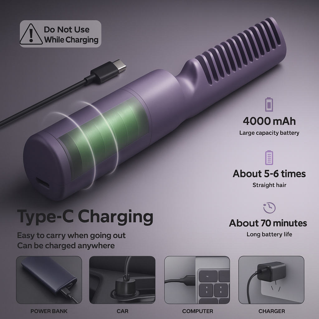 Built with a lightweight 18.5 × 3.5 cm body and a comfortable grip, it’s perfect for quick touch-ups at home, in the car, at the office, or while travelling. The rechargeable battery keeps you styling on the move, and the comb design ensures safe, snag-free use.